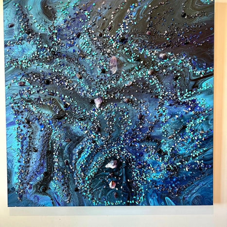 Within each canvas, crystals have been carefully placed — clear quartz, blue quartz, aventurine, sodalite, agate, amethyst, turquoise, and others — not as mere adornment, but as living companions in the work. They pulse with their own frequencies, expanding the energy of the colors, holding space for healing, and offering a silent blessing to all who stand before them.